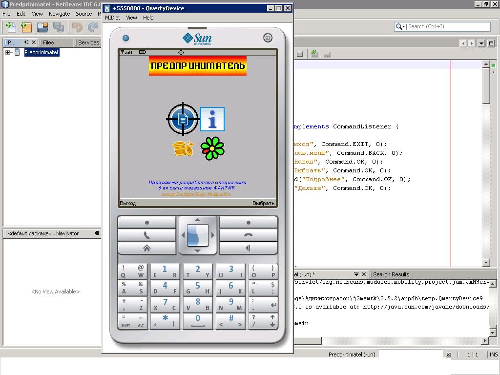 Программа для тел на яве 1.0 Очень маленькое подобие 1С 7.7 1.все работа сводится с работой с ФТП 2 есть справочник товарами в нем только разный поиск 3.есть журнал продаж (в нем расходные накладные и возвраты) 4. есть касса (показывает только одну сумму) 5 есть чат 6 маленький нюанс, в справочнике и накладных набор с помощью DataMatrix . P.S. КодЫ и все заготовки, должны быть открыты, для дальнейшей работы. |