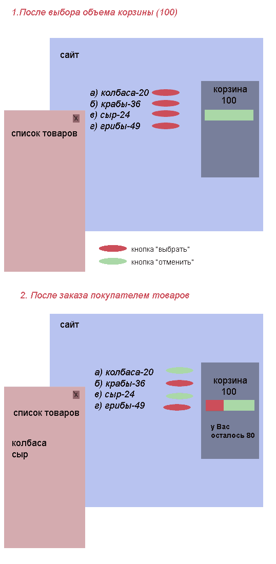 Мне на сайте нужен программный модуль. Кто готов взяться за выполнение работы – пишите вашу цену, сумма ориентировочная. Чтоб было понятно, чего я хочу, поясню на примере. У нас есть корзина – емкость, с назначенным объемом, который пользователь сначала выбирает из трех вариантов – 100 единиц, 200 единиц или 300. У пользователя, когда он выбрал объем корзины, так же появляется список купленных товаров (поначалу он пуст). Корзина с числом – скажем, пользователь выбрал 100 – располагается справа сверху, после шапки сайта. Список товаров, уже находящихся в его корзине, пользователь смотрит, нажав на кнопку ниже корзины (список появляется в новом окне). В этом списке после каждого товара есть кнопочка – «удалить» - при нажатии на нее происходит операция отмены, то есть каждый товар можно удалить из списка. Контент сайта составляет список товаров. У каждого товара есть название и объем. Когда пользователь жмет на товар, в...