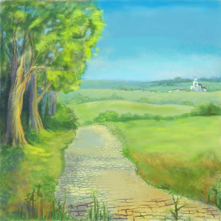 Мариша, огромное спасибо Вам! Мне такое решение очень понравилось, как-то всё сразу стало на свои места. Левый угол композиционно пока будет пустым, там позднее будет вставляться идущий персонаж. Он -то и должен будет стать центром композиции. Но я вот только фон должна нарисовать. Просили не делать абсолютно фотореалистичным, сохранить рисованность. Ещё раз спасибо за реально дельный совет!