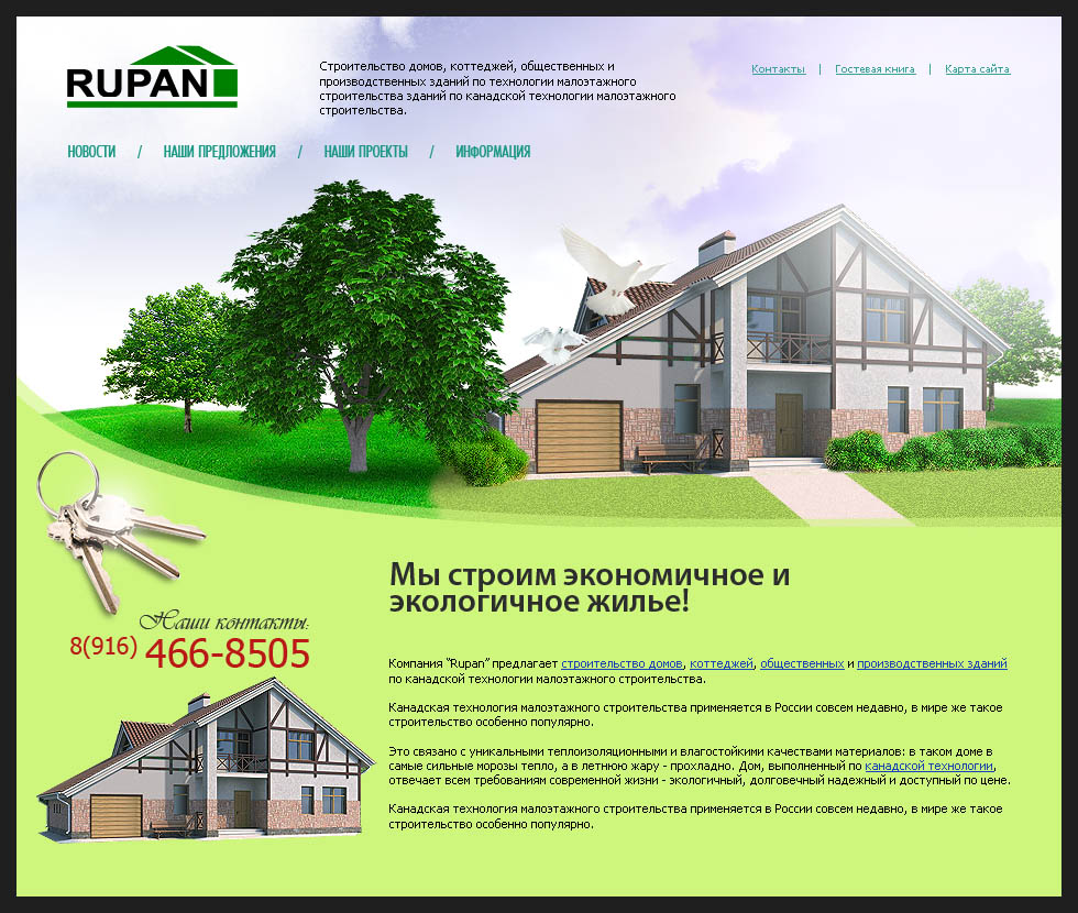 У зеленых ссылок совсем другой оттенок чем основной цвет сайта, чем основной цвет логотипа, который более желтый оттенок имеет. Непонятно почему трава разных цветов. Будет интереснее сделать цвет цифр телефона переходящий, от цвета крыши, да теперешнего. Деревья класные)! Тому что ближе нужно добавить теней. Окнам добавить отражений.