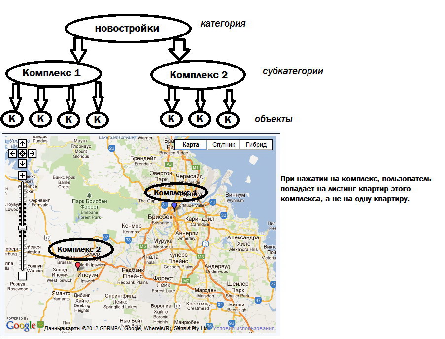 1. Перевести на карты google maps API V3. 2. Добавить поиск по районам городов с привязкой к карте. 3. Добавить дату добавления объявления. 4. Настройка компонента для добавления меток на карте через админ панель (например программой Gmap). 5. Создать субкатегории с картинками в компоненте. 6. Доработать компонент Realty map под API V3 7. Концепция с субкатегориями заключается в следующем: Субкатегориями будут выступать Новостройки, в которых будет определенное кол-во разных квартир. На карте квартиры будут перекрывать друг друга и видна будет только одна квартира. Соответсвенно выхода два, либо "прикручивать" к субкатегориям возможность вывода на карту метки. Либо делать метку, например программой Gmap с названием субкатегории и внутренней ссылкой (link) на листинг квартир каждого комплекса отдельно (смотрите вложение). Может Вы видите другое решение...