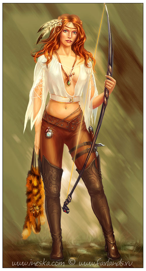 Вот такая вот охотница. Простите за лишний эротизм, но заказчик просил сильно открыть ей грудь. Об удобстве такого одеяния на охоте говорить не приходится :))