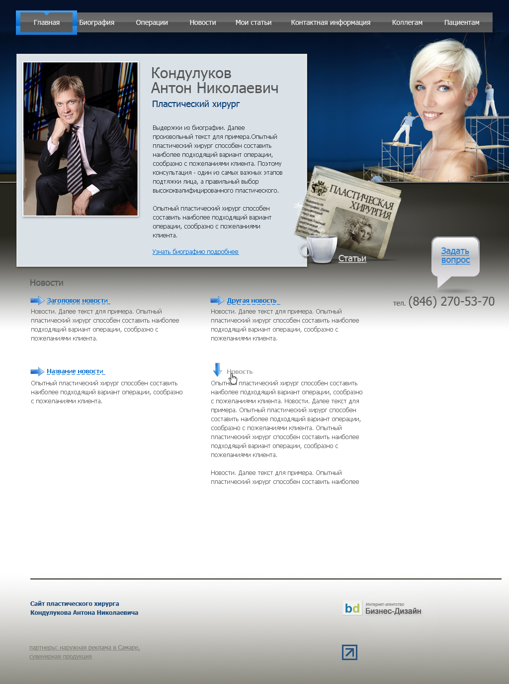 Нужно сделать дизайн для моего личного некоммерческого сайта, где я размещаю разные свои заметки и фото. Но это не фотосайт и не блог в типичном представлении. По стилю он должен быть лаконичным, но не выглядеть бедно. Возможно использование элементов веб 2.0. Дизайн не должен быть глянцевым, т.е. без переливающихся кнопок и т.п. Цвета не должны быть яркие и тёмные. Иллюстраций рисовать не нужно. Иконки и лого - возможно потребуется. В основном от дизайнера требуется выбор правильного дизайн решения по размещению контента (стандартные шаблоны не подходят) и чтобы диз соответствовал содержанию сайта. В предложении давайте ссылки на свои работы и стоимость услуги.